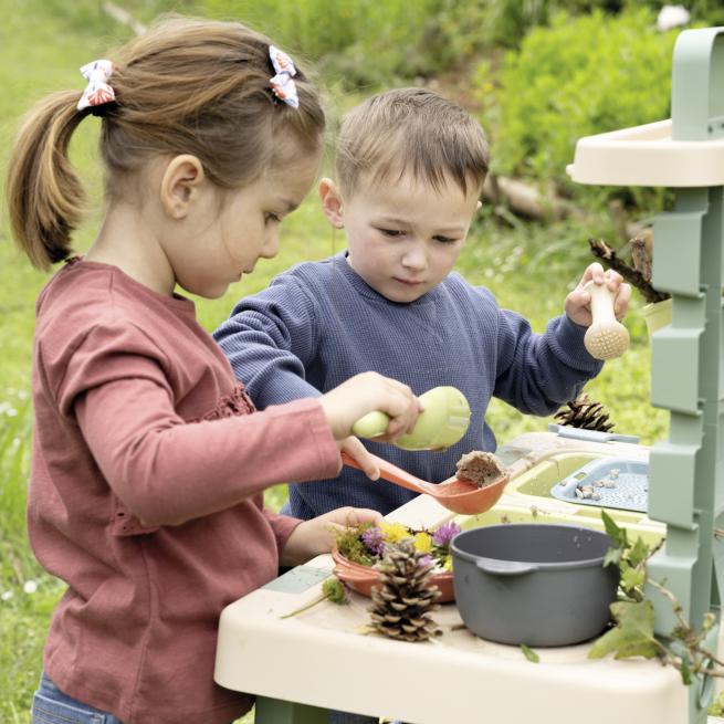 Ist die Matschküche im Außenbereich aufgestellt, ziehen die Kinder gleich los, um Erde, Sand, Steinchen, Blätter, Nüsse und Stöckchen zu sammeln. Die hierfür passenden Gerätschaften und Werkzeuge, wie z. B. Becher, eine Schüssel mit Henkel, ein Schäufelchen sowie eine kleine Harke, sind in der Start-Ausstattung der Küche mit dabei. Haben die Kids genug zusammengetragen, macht Ihnen auch das anschließende Zerkleinern, Vermischen und spielerische Verarbeiten der Materialien richtig Laune. Dabei erfahren die Kinder zugleich auf intensive Weise ihre Umwelt und lernen ganz haptisch die Eigenschaften der einzelnen Stoffe kennen.