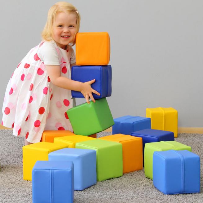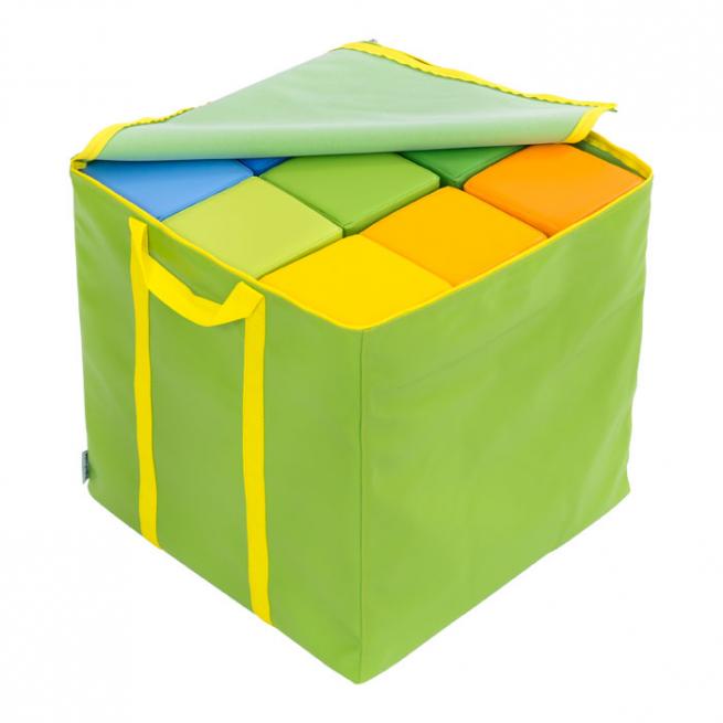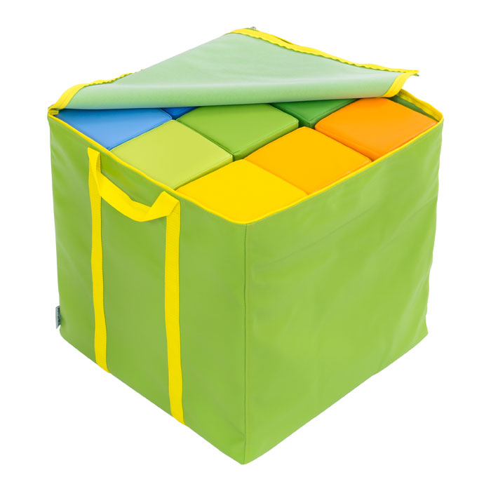 Ob Türme oder Häuser bauen – die 27 Bausteine in hellen Farben stapeln und legen Ihre Kinder ganz einfach. Dank superleichter Schaumfüllung bespielen schon die Allerkleinsten die Softbausteine im Handumdrehen. Toll auch in Rollenspielsituationen, wenn die Bausteine z. B. zur Fracht für LKWs werden. Der Kunstlederbezug ist schwer entflammbar nach DIN EN 1021. Mit praktischer Aufbewahrungstasche.