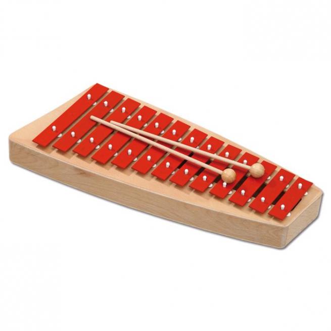 Rot lackierte Klangplatten aus Stahl mit einem Resonanzkasten aus Buchenmassiv- und Buchensperrholz – das ist die NG Serie aus dem Hause SONOR. Entwickelt wurde sie speziell für den Einsatz innerhalb der musikalischen Früherziehung. In diesem Rahmen gehören Glockenspiele zu den typischen Instrumenten. Die Skala umfasst die Töne von c2 – a3 mit fis2 und fis3. Die 16 Klangplatten aus Stahl (20 x 2 mm) sind in einer Reihe auf dem Resonanzkasten angebracht.