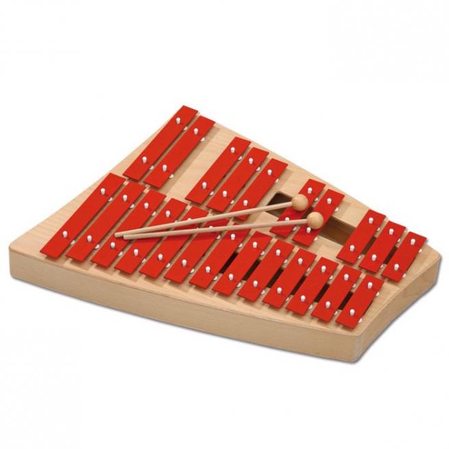 Die chromatische Skala umfasst die Töne von c2 – b3. Die 23 Klangplatten aus Stahl (20 x 2 mm) sind in 2 Reihen auf dem Resonanzkasten angebracht.