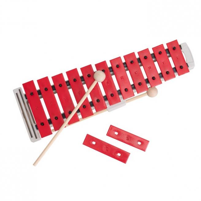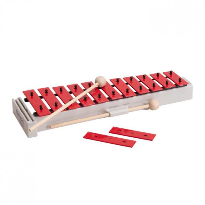 Das typische Orff-Instrument mit roten Klangplatten. Die 11 Klangplatten auf dem Resonanzkörper und die beiden Zusatztöne fis³ und b³ sind auf den flexiblen Kunststoffstiften leicht austauschbar. Die Filzscheiben unterstützen den klaren Klang. Bei Nichtgebrauch einfach in den Halterungen der breiteren Stirnseite aufzubewahren. Die 2 enthaltenen Holzschlägel finden in den seitlichen Halterungen Platz.