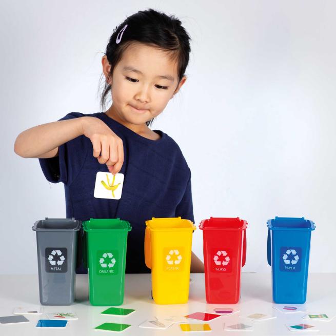Garantiert nix für die Tonne! Das Sortierspiel „Trenne den Müll richtig“ enthält 100 Pappkärtchen mit Abbildungen von Alltagsgegenständen, die die Kinder passend in die 5 verschiedenfarbigen kleinen Müllbehälter für Kompost, Papier, Kunststoff, Glas und Metall sortieren. Lustig, lehrreich und manchmal knifflig, vermittelt das Spiel den Kids das Prinzip des Recyclings und warum es wichtig ist, Abfall zu trennen. Dabei fördert das Spiel zugleich das logische Denken sowie die Fähigkeit, Dinge nach bestimmten Eigenschaften zu kategorisieren. Zur einfachen Selbstkontrolle besitzen die Kärtchen farbige Rückseiten, die zur Farbe des jeweils zugehörigen Abfallbehälters passen. Ab 3 Jahren.