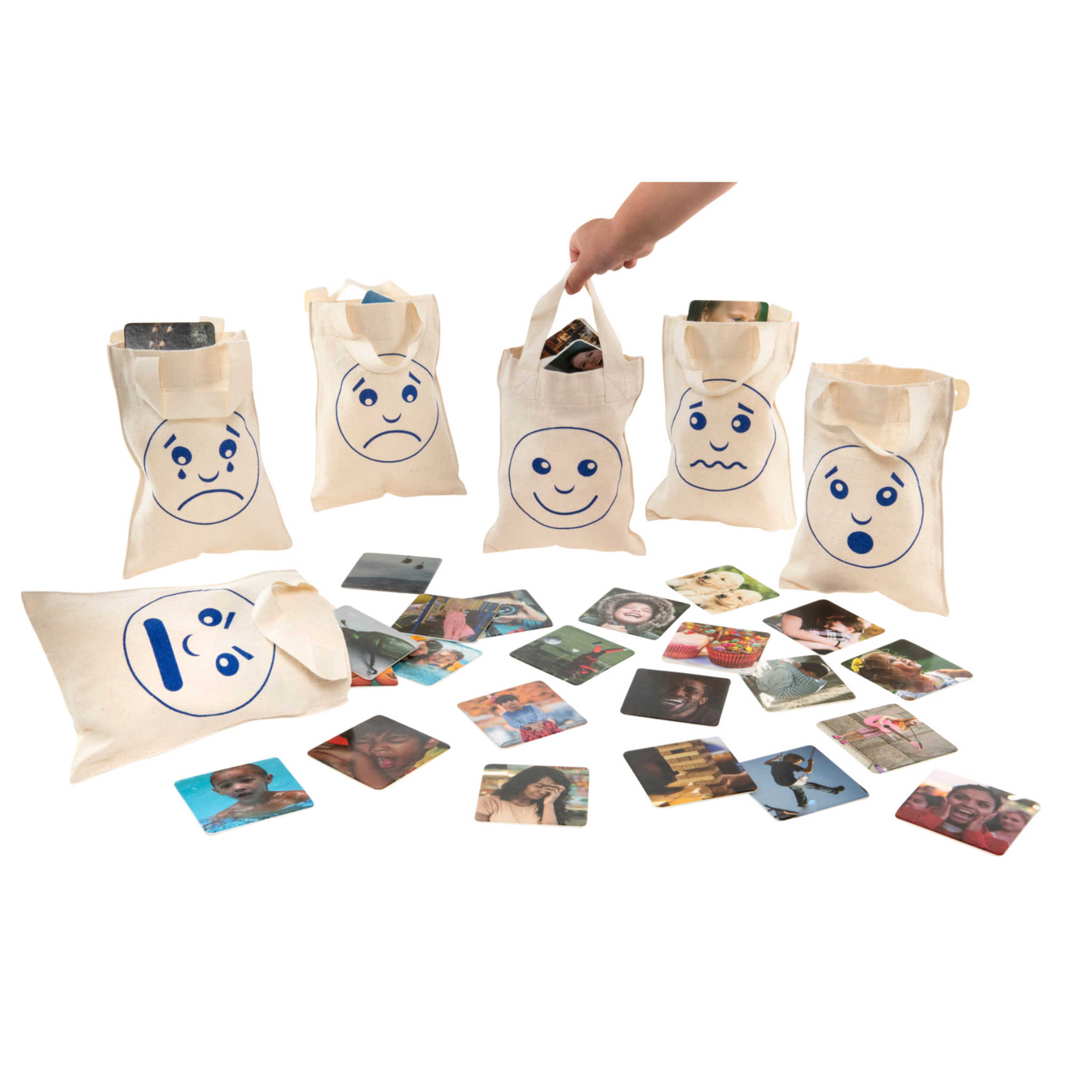 Gefühle und Emotionen sichtbar machen, ins Gespräch kommen, Empathie trainieren. Die 60 hochwertigen Fotokarten zeigen Tiere, Objekte, Situationen und Gesichter, die bei Kindern starke Gefühle auslösen – vom knuddeligen Welpen bis zum bedrohlichen Gewitter. Sechs robuste Baumwolltaschen, jeweils mit einer Emotion bedruckt (u. a. traurig, verärgert, glücklich), strukturieren das Sortieren. Die Kinder erzählen, wie sie sich beim Anblick der jeweiligen Karte gefühlt haben und ordnen die Karten dann der entsprechenden Tasche zu. Ideal für Morgenkreis, Freiarbeit und Förderstunden in Kita und Grundschule.