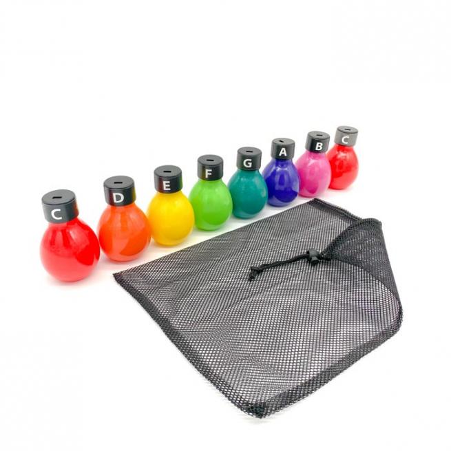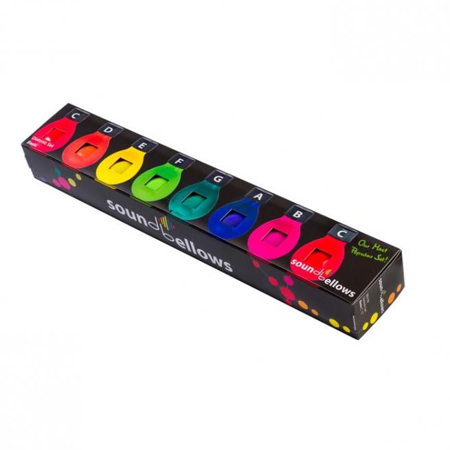 Jedes Drücken erzeugt einen Ton. Die Soundbellows® gehören zur Familie der Eintoninstrumente. In jedem der 8 kleinen Blasebälge ist eine Stimmzunge verarbeitet, die nach dem sanften Drücken den Ton freigibt. Je kürzer die Stimmzunge, desto höher ist der Ton, je länger, umso tiefer. Die Farbcodierung entspricht den bekannten BOOMWHACKERS®. So steht z. B. die Farbe Rot für das C, das Gelb fürs E und so weiter. Die Soundbellows® sind optimale Begleitinstrumente und bestens geeignet für kleine bzw. schwache Hände. Der Klang erinnert an den der Mundharmonika.