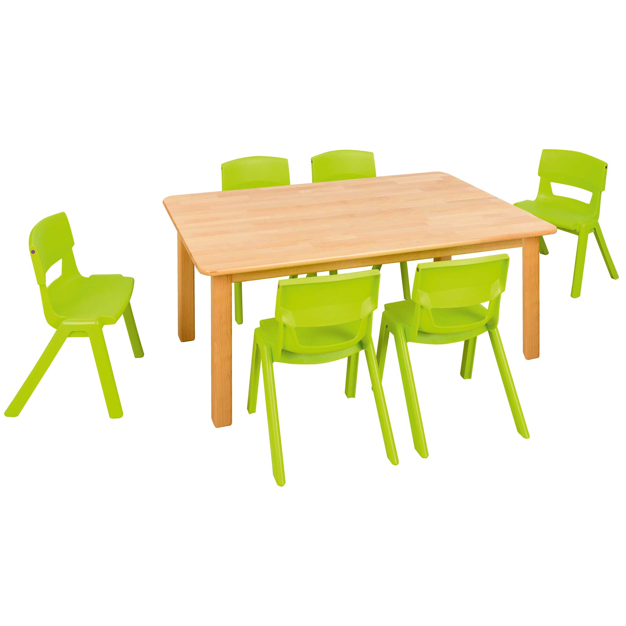 Set aus Massivholz-Rechteck-Tisch 120 x 80 cm und 6 Postura+ Kindergartenstühlen.