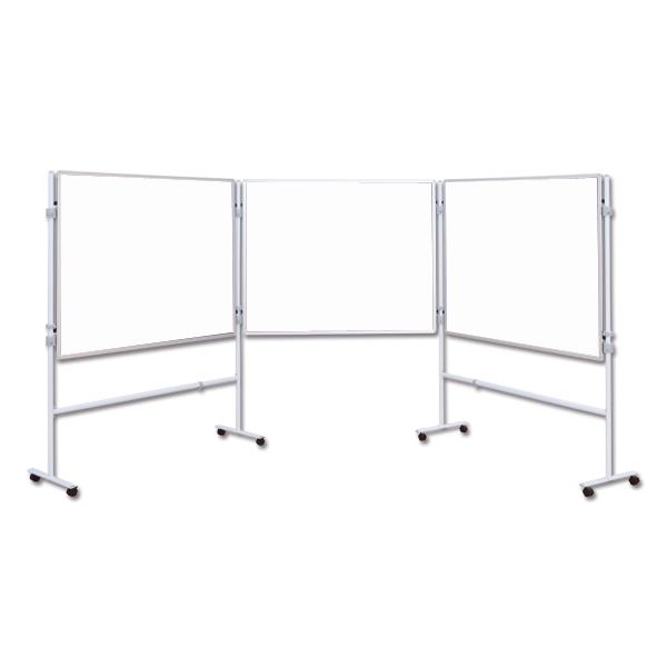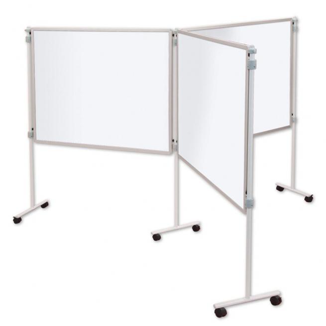 Bestehend aus 3 Tafeln (120 x 150 cm, Tafeloberfläche weiß) und 2 fahrbaren Stativen. Mit Whiteboard-Markern beschreibbar und einfach nass oder trocken abwischbar.