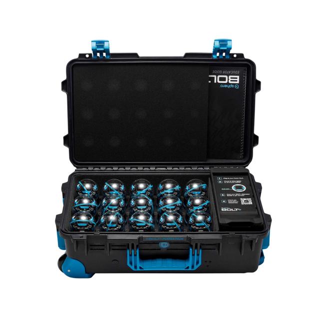 Das Sphero BOLT+ Klassenset umfasst 15 Coding-Roboter inklusive Akku und weiterem Zubehör, verstaut im robusten und verschließbaren Transport- und Ladekoffer. Das Set bietet Coding-Herausforderungen in unterschiedlichen Schwierigkeitsgraden und eignet sich für bis zu 30 SuS, denn jeder Bot lässt sich durch bis zu 2 Schüler gemeinsam verwenden. Dabei besitzen alle BOLT+-Roboter eine bruchfeste und wasserdichte, durchsichtige Schutzkapsel – perfekt für den Einsatz sowohl im Innen- als auch im Außenbereich.