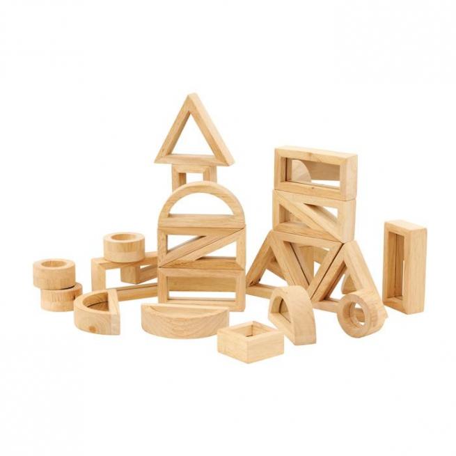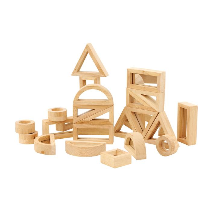 Die Spiegel-Bausteine sorgen für noch mehr Abwechslung in der Bauecke. Spielerisch werden dabei erste Erfahrungen zu Spiegelungen und geometrischen Formen gemacht. Die doppelseitigen Spiegelflächen sind von stabilen Holzrahmen umschlossen.