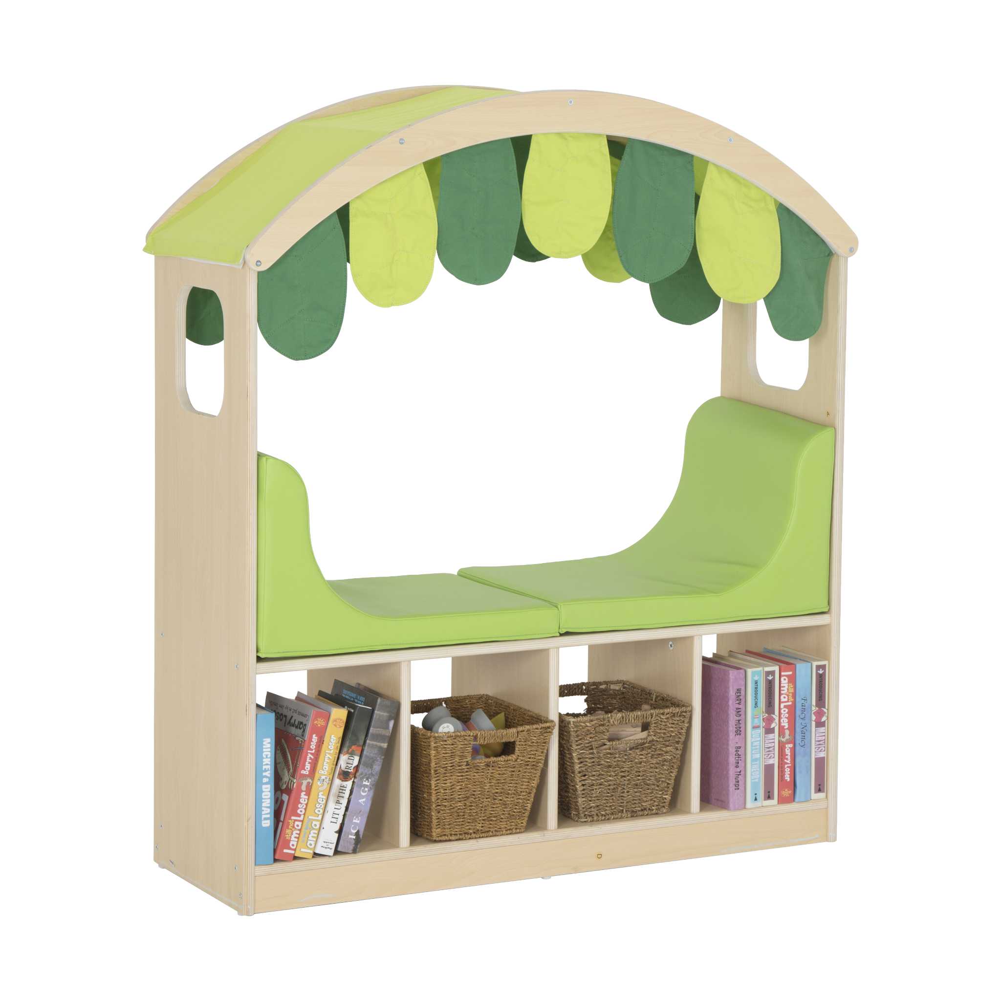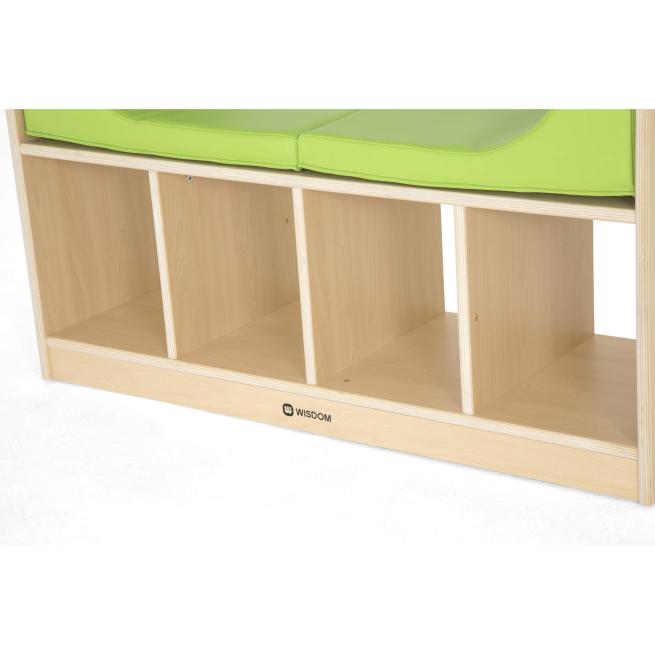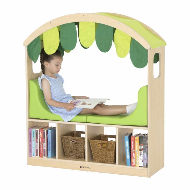 Stauraum trifft Leseecke. Mit dem Spiel- und Leseregal verbinden Sie in Ihrem Gruppenraum Ordnung und Gemütlichkeit. Dieses Leseregal kombiniert 4 offene Fächer für Bücher, Boxen oder Spielzeug mit einer gepolsterten Sitzbank unter einem einladenden Blätterdach. Das grüne Sitzpolster und das Dach befestigen Sie sicher per Klett. Beides ist schnell und einfach zu reinigen. Ideal für Kita, Krippe und Eingangsklassen. Bis zu zwei Kinder nehmen auf der Sitzbank bequem Platz, blättern in Bilderbüchern oder entspannen nach der Freispielphase. Unter dem Blätterdach genießen sie gern eine kleine Auszeit. 10 Jahre Herstellergarantie. Zur einfachen Selbstmontage.