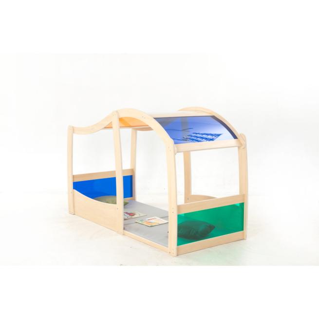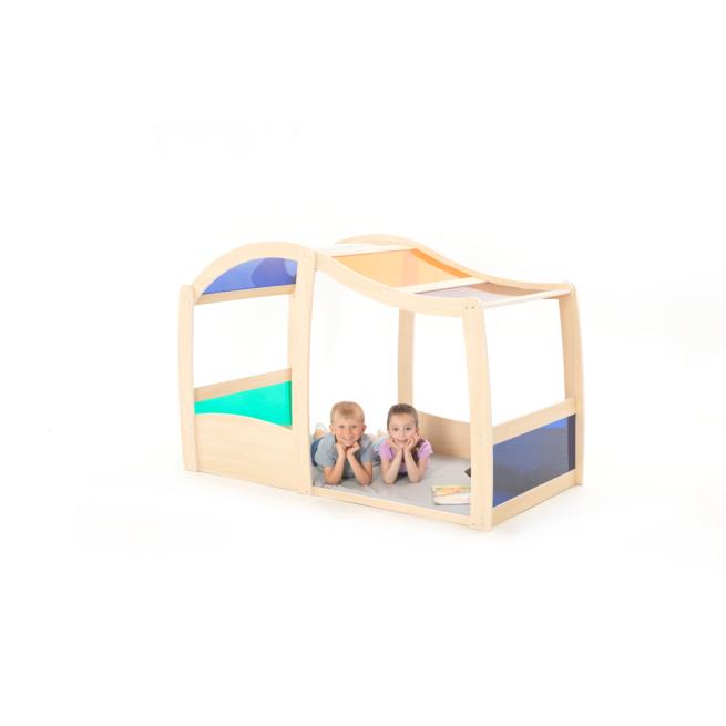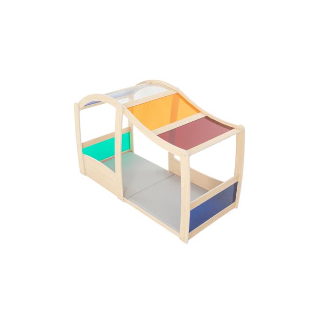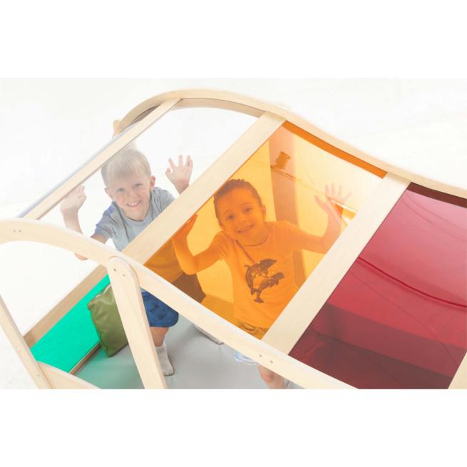 Das Spiel- und Regenbogenhaus bietet Kindern einen einladenden Raum, in dem sie spielen, entdecken, zusammen lachen und ihre Fantasie lebendig ausleben. Mit seinen großzügigen Maßen finden mehrere Kinder gleichzeitig Platz, um im Regenbogenhaus gemeinsam Rollenspiele auszuprobieren und kreative Ideen zu verwirklichen. Die bunten, durchscheinenden Scheiben lassen Licht hereinscheinen und schaffen eine freundliche, offene Atmosphäre. Die weiche Bodenmatte sorgt für Komfort beim Sitzen und Spielen, während robuste Materialien für Langlebigkeit und Sicherheit stehen. Zur Selbstmontage.
