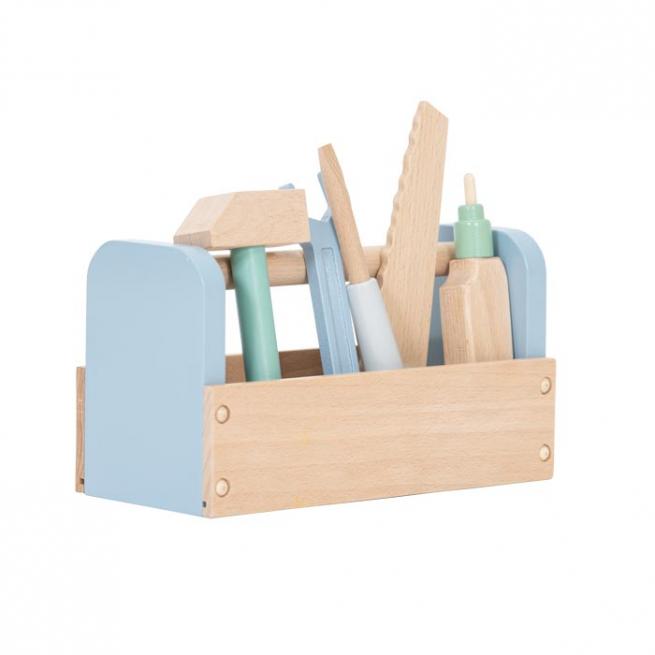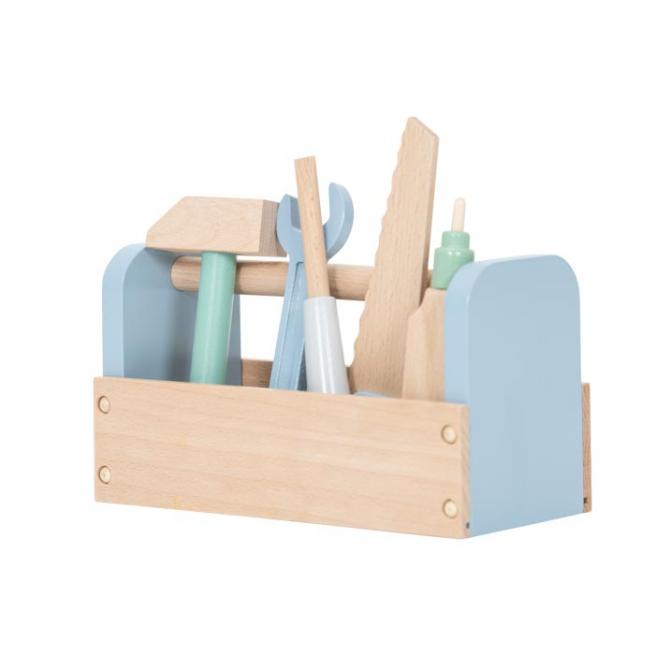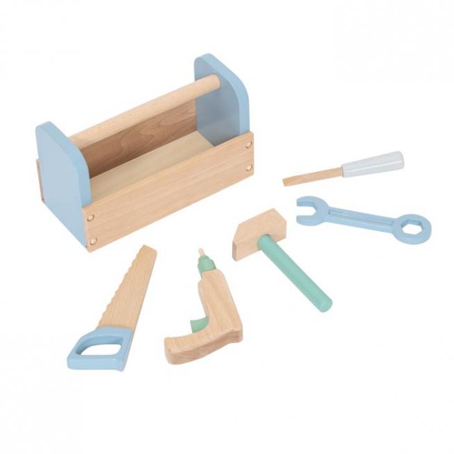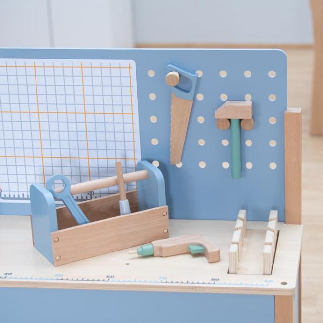 Ob einzeln oder in Verbindung mit der Spiel-Werkbank – mithilfe des hervorragenden Werkzeugs setzen kleine Handwerkfans all ihre großartigen Konstruktionsideen um. Säge, Hammer, Bohrmaschine, Schraubenschlüssel und Schraubendreher sind im klassischen Werkzeugkasten mit Tragegriff bestens aufgehoben.