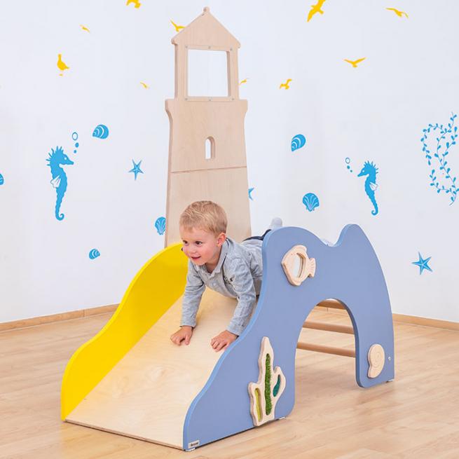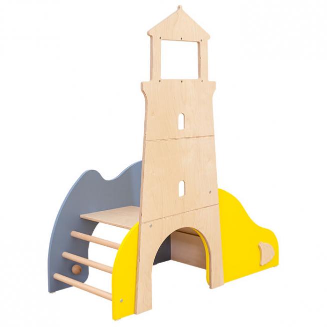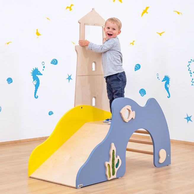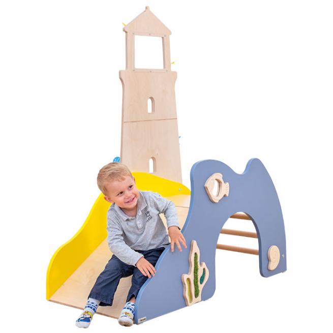 Hier entdecken Ihre Kleinen einiges: Ob klettern, rutschen, durchkriechen oder fühlen – der Leuchtturm ist die optimale Spielburg für Ihre kleinen Sinnesentdecker. Ausgestattet mit drehbarer Muschel, Seegras zum Fühlen und einem Acrylglasspiegel. Der Ausguck ist ebenfalls mit Acrylglas versehen. Die Spielburg wird komplett montiert geliefert.