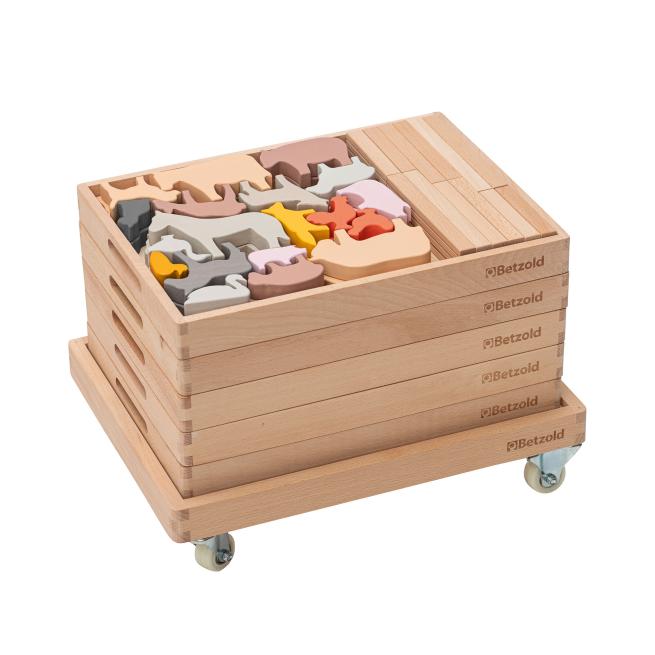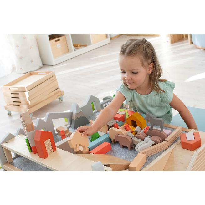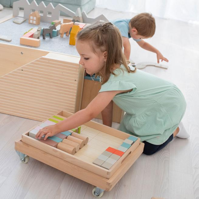 Mit dem Spielwelt-Bausteinwagen bauen Kinder Straßen und Brücken, errichten Häuser und gestalten ganze Städte. Sie legen Landschaften an, setzen Figuren und Tiere ein und entwickeln eigene Geschichten. So entstehen spannende Rollenspiele, die Fantasie, Sprache und soziales Miteinander fördern. Nach dem Spielen sortieren die Kinder die Bausteine eigenständig in die 5 Tabletts zurück und üben dabei Struktur und Ordnung. Der Wagen ist mobil und flexibel einsetzbar – die Kinder rollen ihn einfach dorthin, wo sie bauen und spielen. Erweitern Sie Ihre Bauecke und schaffen Sie mit dem Spielwelt-Bausteinwagen eine kreative Bauwelt voller Möglichkeiten.