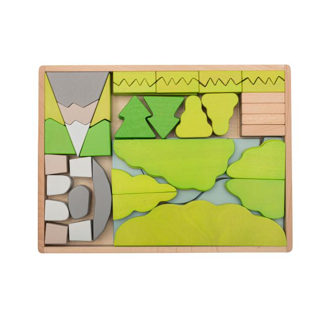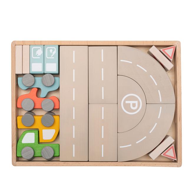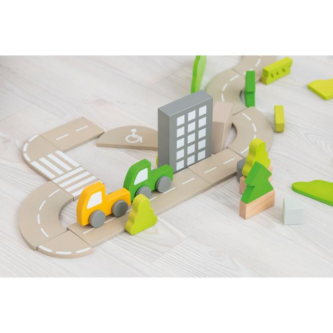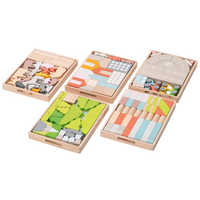 • Bausteine rund um die Themen Straßen, Landschaft, Häuser, Menschen, Tiere und geometrische Körper