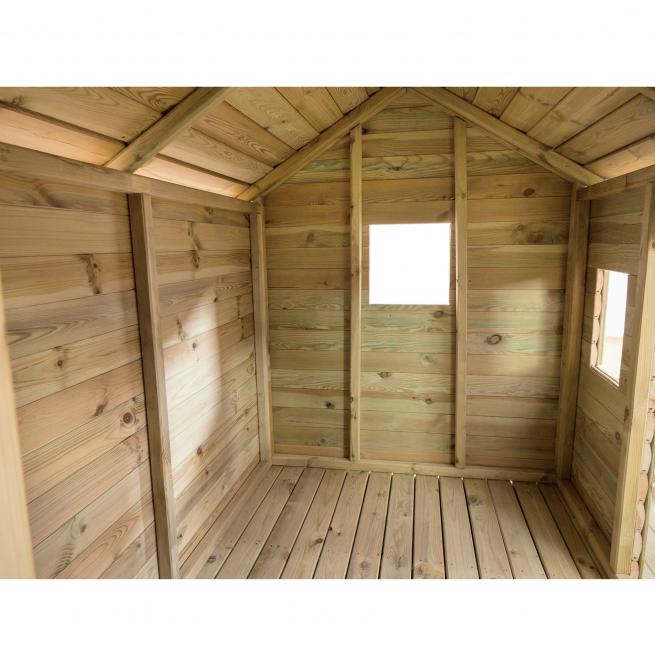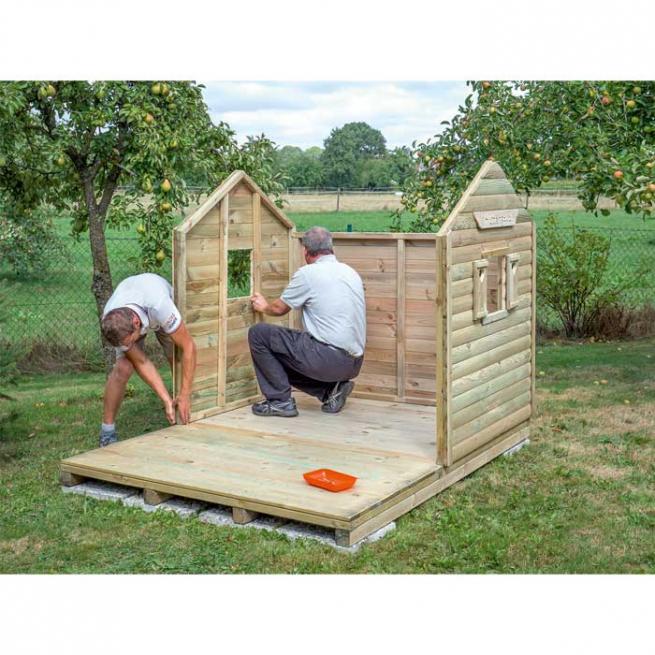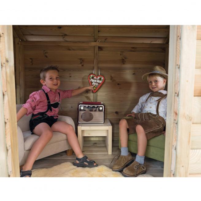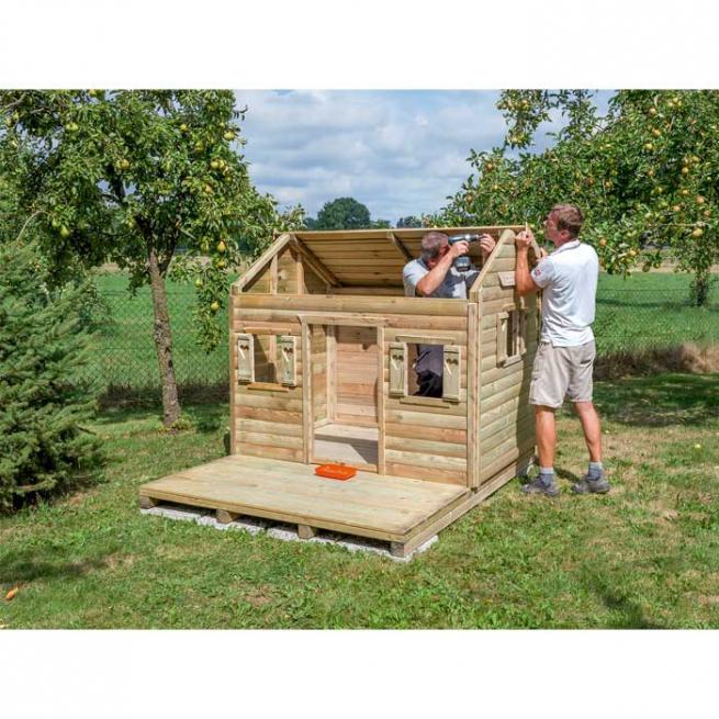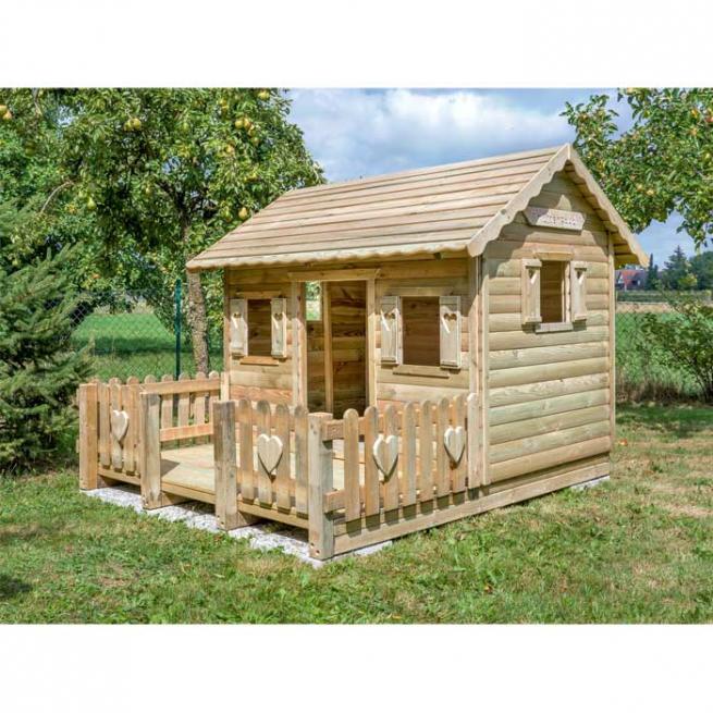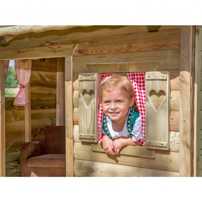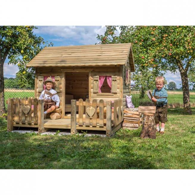 Dieses schmucke Holzhaus im Landhausstil begeistert Groß und Klein. Das liebevolle Design regt Ihre Kinder zu vielen kreativen und spannenden Rollenspielen an. Die Fenster sind mit hübschen Fensterläden ausgestattet. Auf der geräumigen Veranda mit Holzzaun lässt sich das schöne Wetter so richtig genießen.