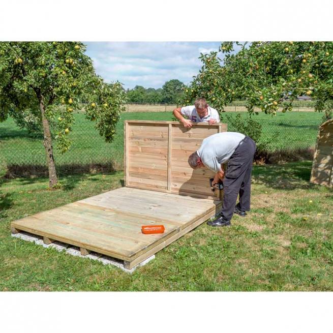- Gesamtabmessung inkl. Dachüberstand<br/>Grundfläche (B x T) 179,5 x 221 cm<br/>Innenmaße Raum (H x B x T)<br/>145 x 120 x 170 cm (bis zur Schräge)<br/>Stärke der Außenwand: 2 cm