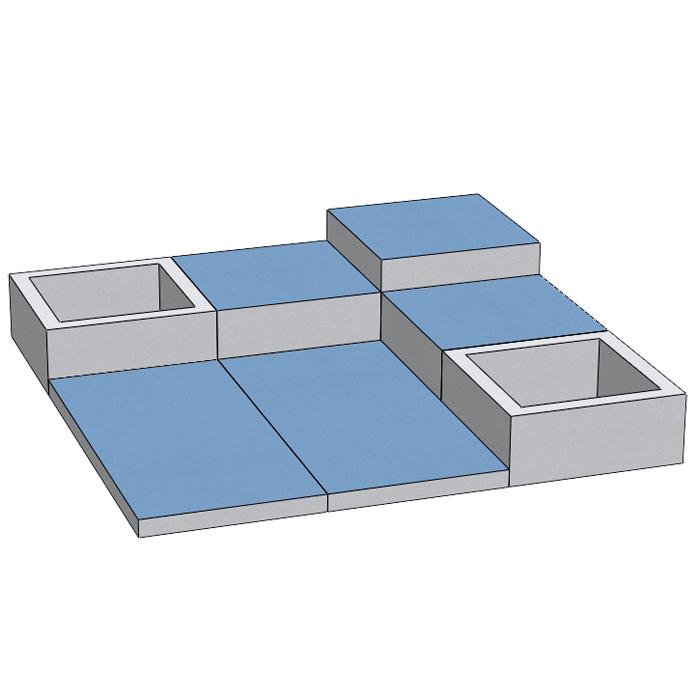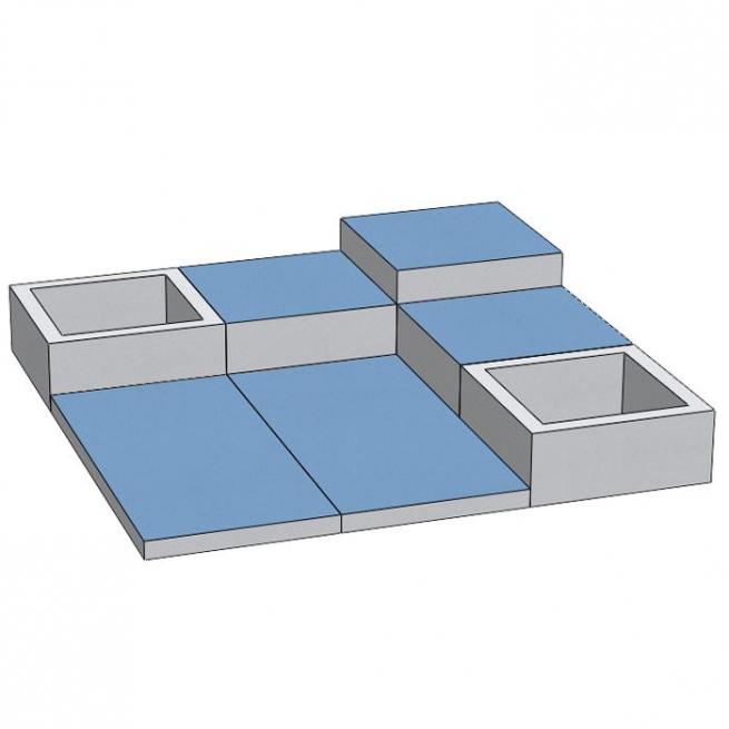 - Matten (120 x 120 x 6 cm)<br>Podest B (60 x 60 x 24 cm)<br>Podest C (60 x 60 x 36 cm)<br>Schaumkiste (60 x 60 x 24 cm)