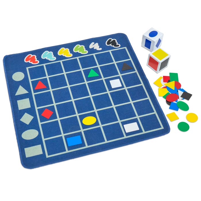 Kreis, Dreieck, Quadrat, Raute, Ellipse und Rechteck in 6 unterschiedlichen Farben. Wer die gewürfelten Formen und Farben auf dem Spielteppich richtig zuordnet, fördert damit wichtige Mathe-Fertigkeiten. Ab 4 Jahren.