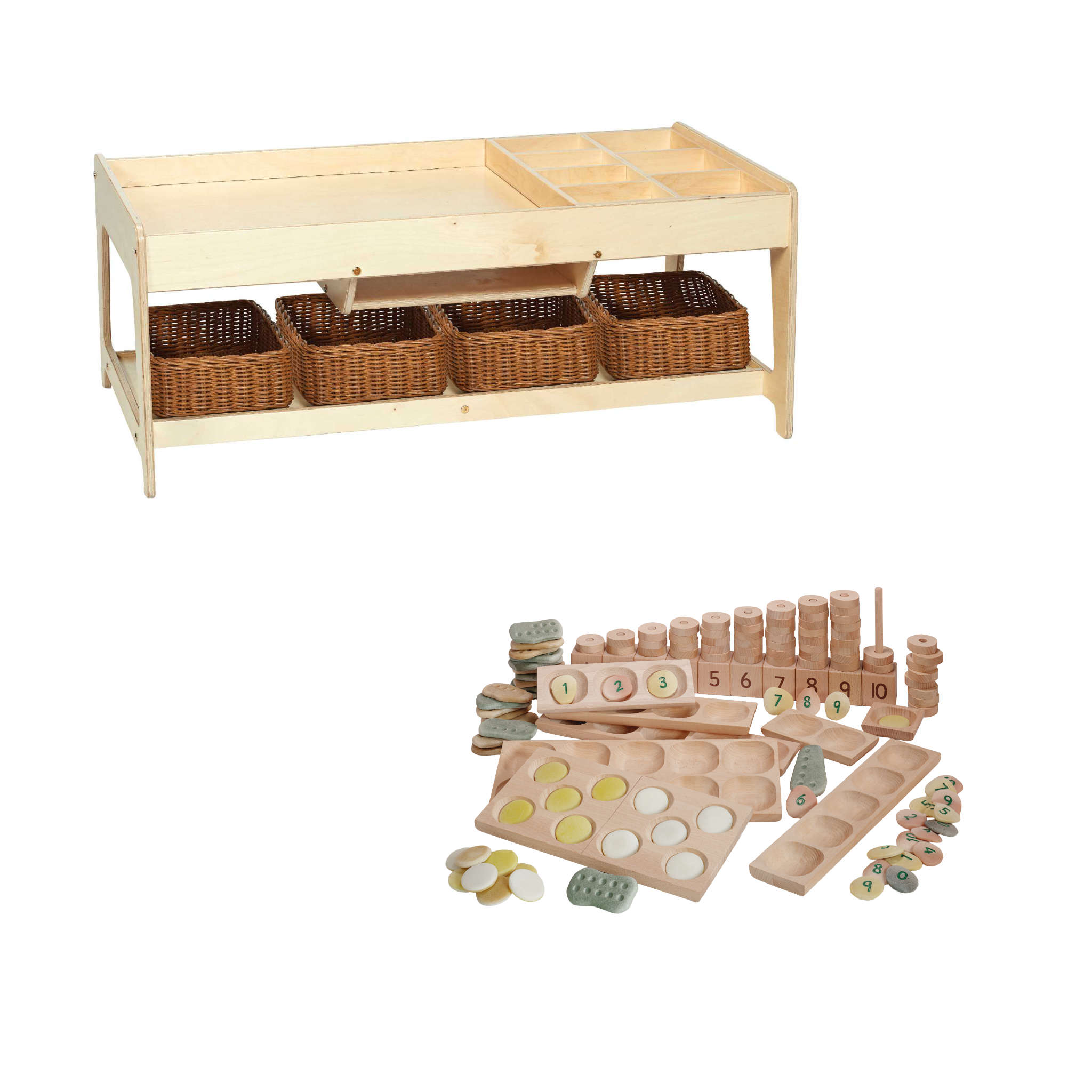 Spieltisch + Mathe-Set in der Rundum-Sorglos-Kombination mit Preisvorteil. Sie erhalten den mit Boxen oder Körben (bitte wählen) vollausgestatteten Spieltisch inklusive umfangreichem Lege- und Sortiermaterial zur mathematischen Frühförderung.