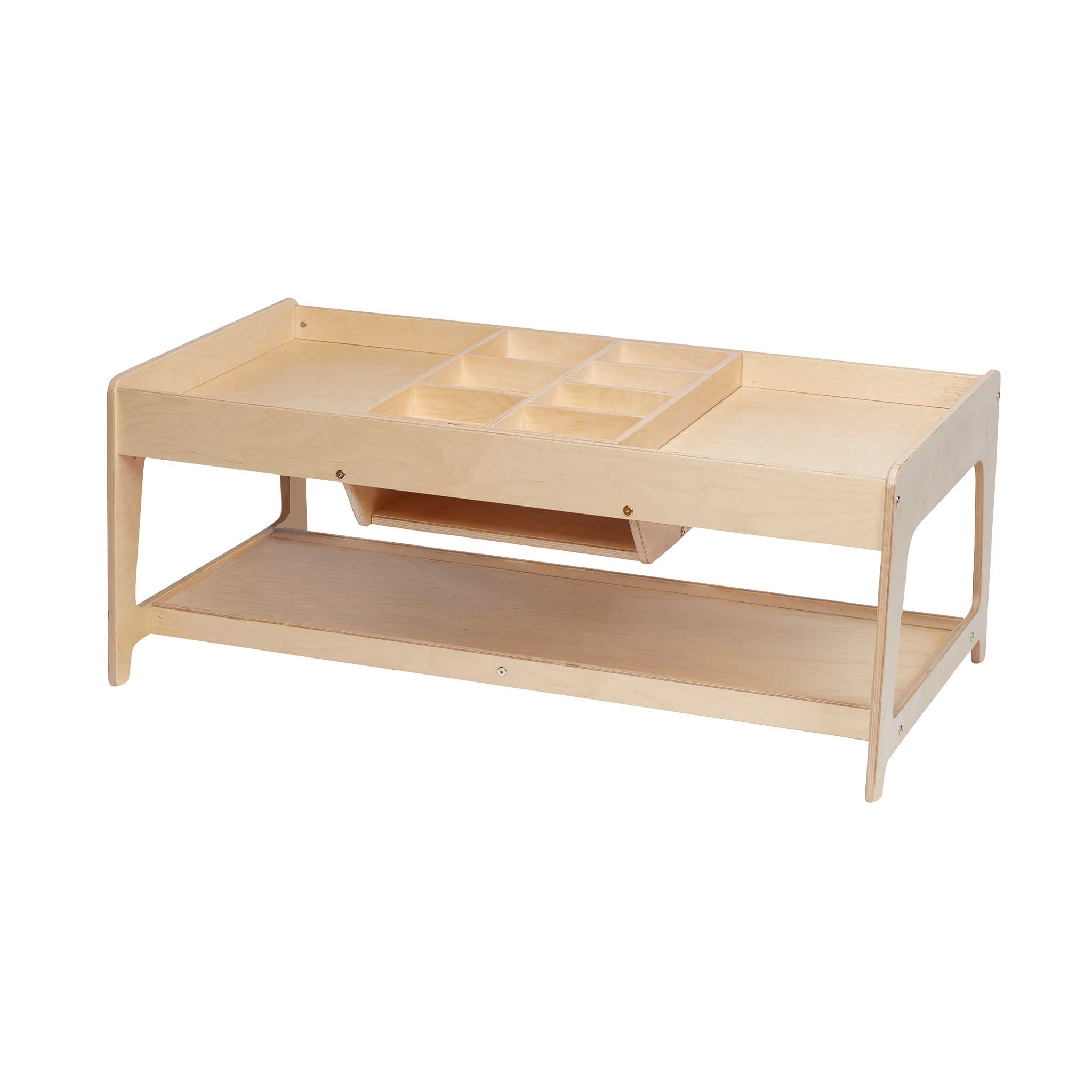 Der kompakte Spieltisch ist eine durchdachte Kombilösung aus Spiel- und Bastelfläche sowie praktischem Stauraum: Er bietet viel Platz für mathematische Lege- und Sortierspiele, zum Basteln und Bauen, zum Unterbringen von Lern- und Sinnesmaterial (nicht enthalten) und für vieles mehr. Dank seiner kindgerechten Zugriffshöhe von nur 46,5 cm eignet sich der Spieltisch bestens für den Einsatz im Kindergarten. Den beweglichen Sortiereinsatz positionieren Sie und die Kinder dabei an beliebiger Stelle auf der Tischfläche. Brauchen Sie den Einsatz gerade nicht, verstauen Sie ihn einfach im unterseitigen Schubfach.