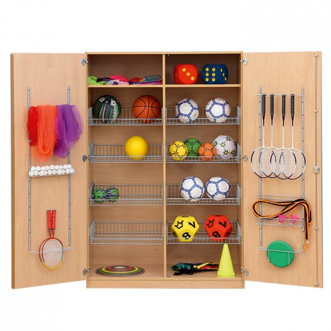 Ihre Sportgeräte sind übersichtlich aufgeräumt. In den eingehängten Gitterkörben bleiben alle Bälle an ihrem Platz. Die Gitterkörbe sind höhenverstellbar. Praktische Gerätehaken an der Tür-Innenseiten nehmen noch mehr Sportgeräte auf.