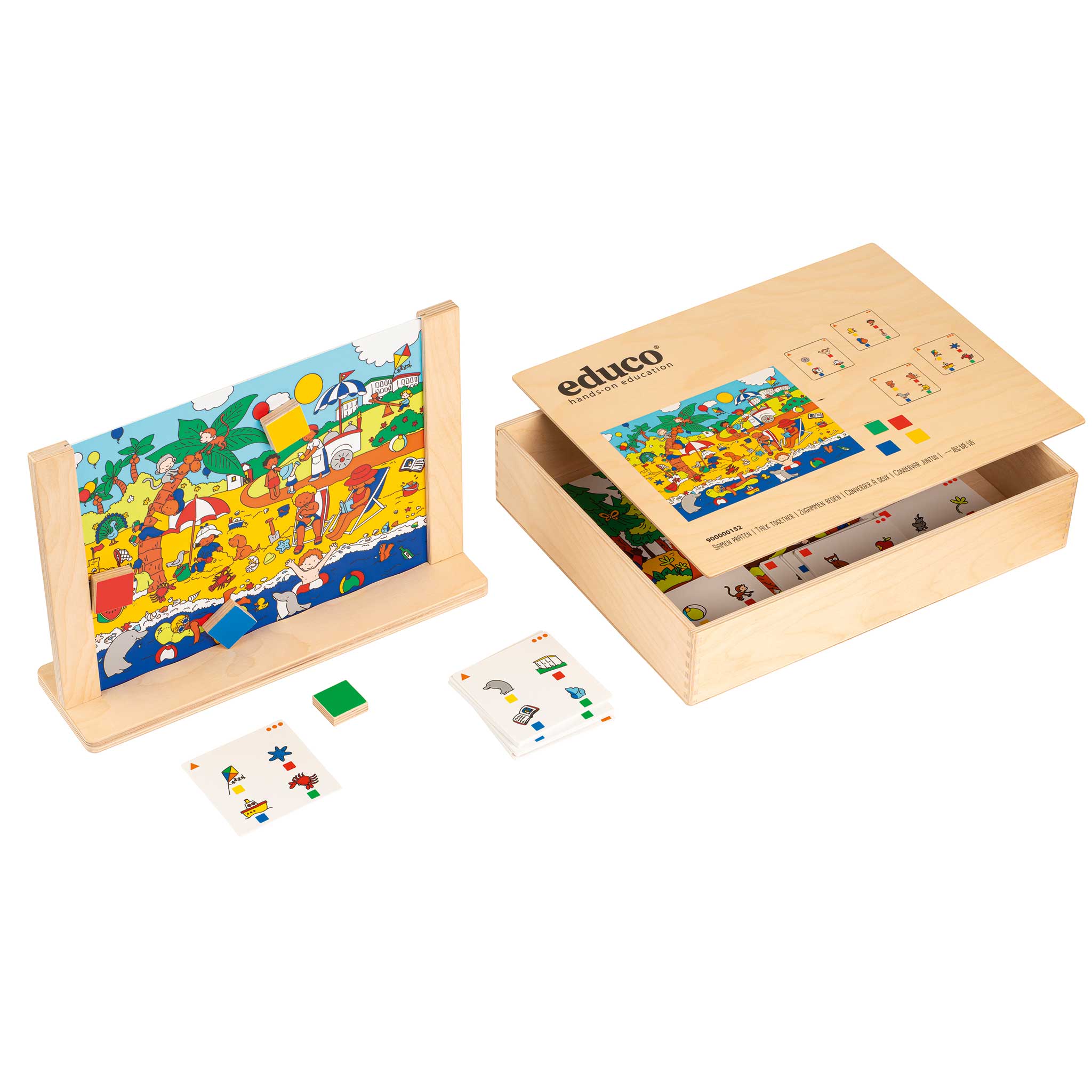 Bei diesem kooperativen Spiel geht es darum, die Abbildungen der kleinen Aufgabenkarten auf der großen Themenkarte zu finden, sich gemeinsam darüber zu unterhalten und den dazugehörenden Magneten entsprechend zu platzieren. Dabei erweitern Kinder spielend ihren Wortschatz und fördern ihre Kommunikationsfähigkeit.