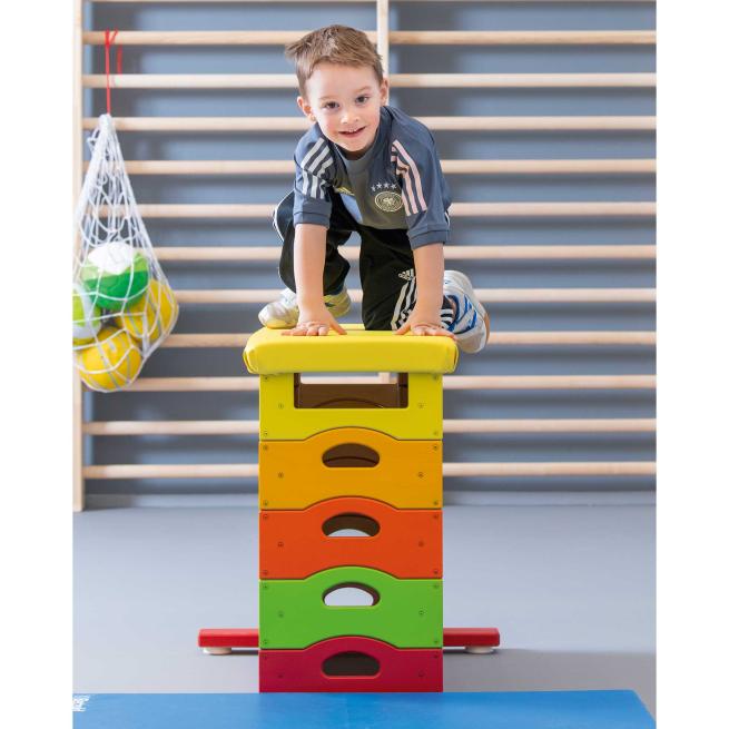 Unser Tipp: Kombinieren Sie den Sprungkasten Regenbogen mit der bunten Turnbank für Kinder, die genau in die Haltevorrichtung des Sprungkastens passt.