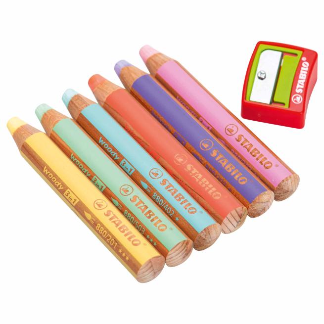 Stabilo Woody 3 in 1 – das sind Buntstift, Wassermalfarbe und Wachsmalkreide in einem! Hier im 6er-Set in sanften Pastellfarben inklusive 1 Anspitzer, ideal für spannende Mal-Abenteuer und zur Ergänzung Ihres Woody-Stiftevorrats.