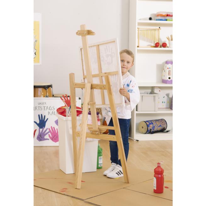 Diese Staffelei aus Buchenholz ist dank einer Schraubfixierung höhenverstellbar, damit jeder kleine Künstler auch seine perfekte Malhöhe findet. Die niedrige Höhe ist ideal für Kinder zwischen 3 und 10 Jahren. Die stabile Staffelei ist von einer Seite zu verwenden. Sie ist einfach aufzubauen und platzsparend zusammengeklappt zu verstauen.