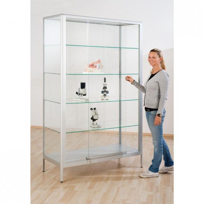 Boden aus farbbeschichtetem Stahlblech in Silber, Schiebetüren in Aluminiumführung mit wartungsfreiem Metall-Rollenbeschlag. Die 100 cm breiten Vitrinen haben Drehtüren.