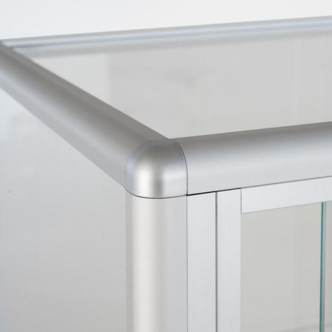 Formschön und sicher präsentieren sich die Vitrinen NIC4000. Aluminiumprofile von 25 x 25 mm sind solide und filigran zugleich. Rahmen und Eckverbinder aus Zinkdruckguss sind zur Unfallverhütung abgerundet. Die 4 Dickglasböden der Vitrine stellen Sie stufenlos auf die gewünschten Abstände ein, besonders praktisch, wenn Sie unterschiedlich große Exponate unterbringen wollen. Sie tragen eine verteilte Last von 15 kg pro Boden. Zur Sicherheit sind alle Glasteile aus ESG-Sicherheitsglas gefertigt. Die Schiebetüren verschließen Sie mit einem Sicherheitsschloss.