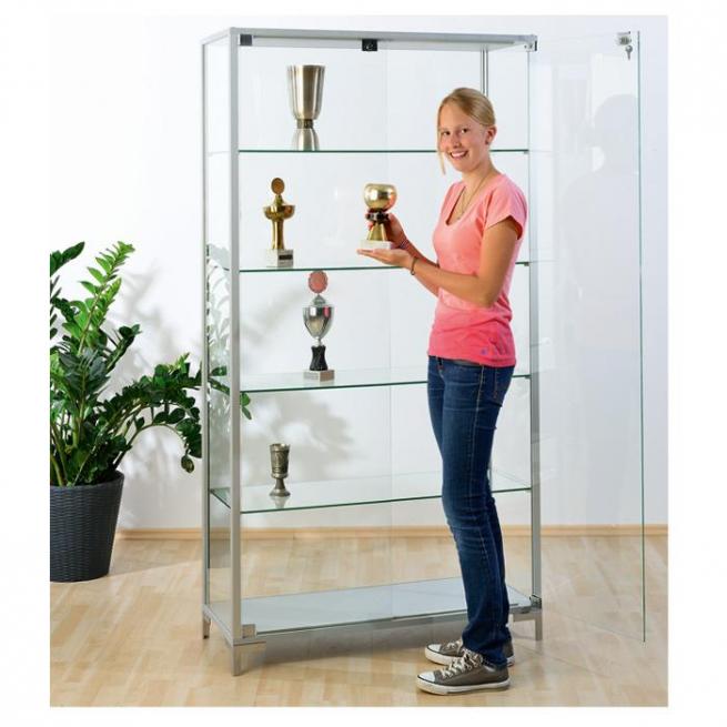 Großer Vitrinenschrank mit 4 ESG-Böden. Jeder Boden hat ein Tragkraft von 15 kg. Bis zu einer Größe von 100 cm Breite hat die Vitrine Drehtüren. Die 150 cm breite Version hat eine Schiebetür.