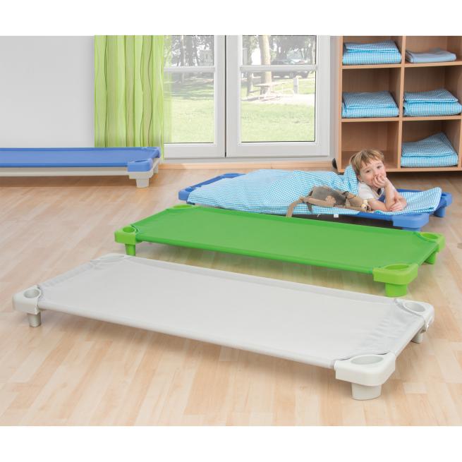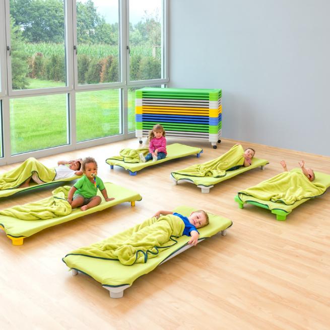 Bereits vielfach bewährt in Kinderkrippen und Kitas. Besonders dort, wo kein eigener Schlafraum zur Verfügung steht, garantieren die platzsparend stapelbaren Liegen eine optimale Raumnutzung. Durch das geringe Eigengewicht der Liegen helfen Ihre Kinder gern mit beim Auf- und Abbau ihrer Schlafstätte. Die Bettfüße stecken ohne Hohlräume sicher ineinander. Selbst mit Rollen ineinander stapelbar.