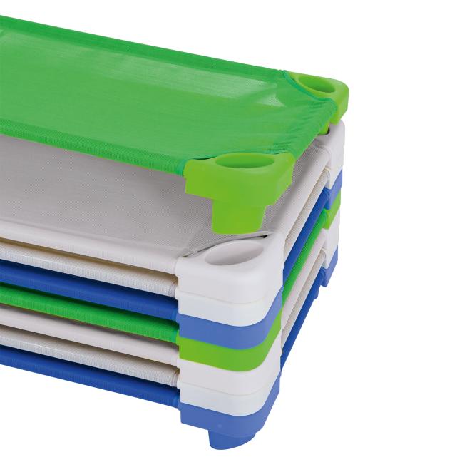 Bereits vielfach bewährt in Kinderkrippen und Kitas. Besonders dort, wo kein eigener Schlafraum zur Verfügung steht, garantieren die platzsparend stapelbaren Liegen eine optimale Raumnutzung. Durch das geringe Eigengewicht der Liegen helfen Ihre Kinder gern mit beim Auf- und Abbau ihrer Schlafstätte. Die Bettfüße stecken ohne Hohlräume sicher ineinander. Selbst mit Rollen ineinander stapelbar.