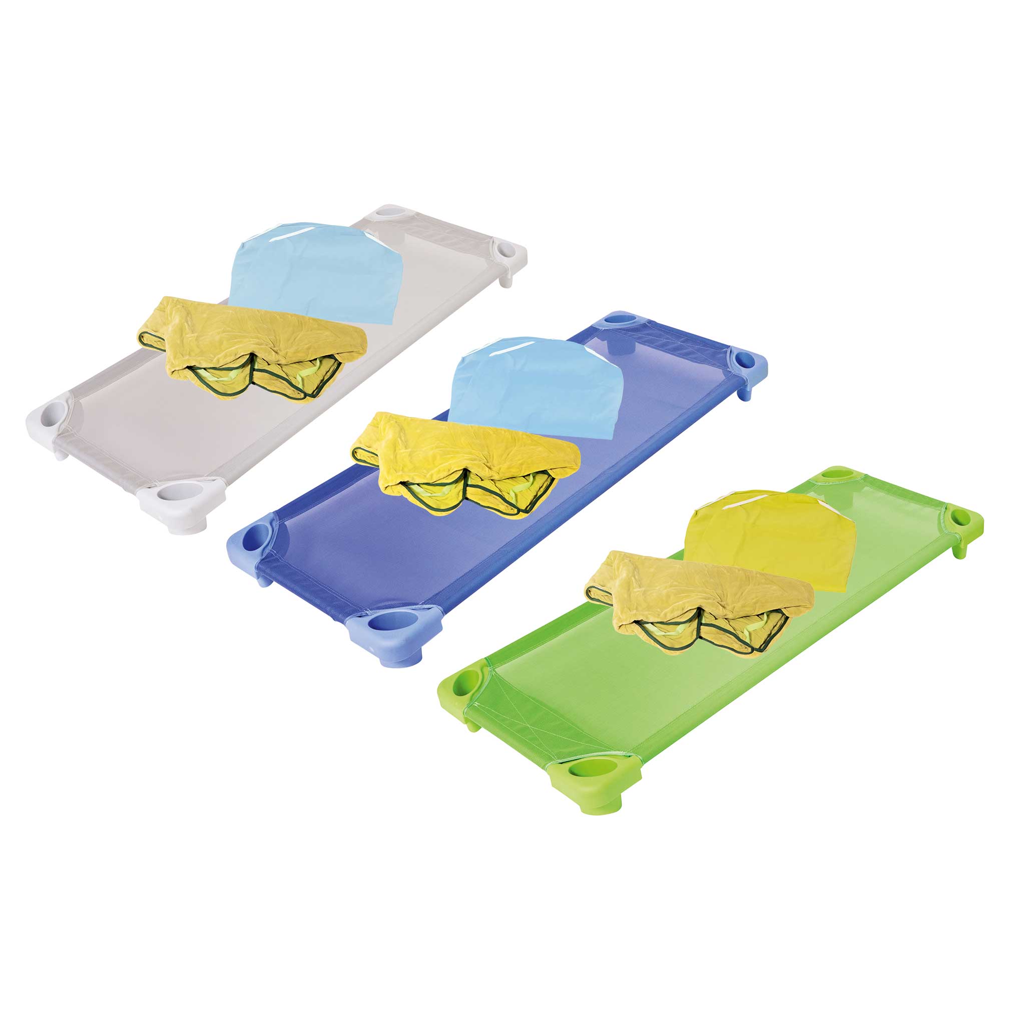 Die platzsparende Liege für Kinder besteht aus widerstandsfähigem Polyester mit Polychlorid-Beschichtung. Dadurch ist sie besonders strapazierfähig und pflegeleicht. Nach Gebrauch wischen Sie einfach mit einem feuchten Tuch drüber und schon ist die Kinderliege wieder einsatzbereit. Die atmungsaktive Liegefläche verhindert Wärmestau und Feuchtigkeitsansammlungen. Dank der schwer entflammbaren Materialien entsprechen die stapelbaren Kinderliegen hohen Sicherheitsanforderungen.Die weiche Auflage aus Baumwolle bietet zusätzlichen Komfort auf der Kinderliege. Im Winter hält sie schön warm. Abgeschrägte Ecken und die Eckgummis bieten sicheren Halt, damit nichts verrutscht. Auflagen- und Liegenfarbe harmonieren bestens miteinander. Zur grünen Liege gehört eine grüne Auflage, zur gelben Liege eine grüne, zur blauen eine blaue und zur grauen Liege eine blaue Auflage. Hygienisch rein waschen Sie die Auflagen bei 60 °C.