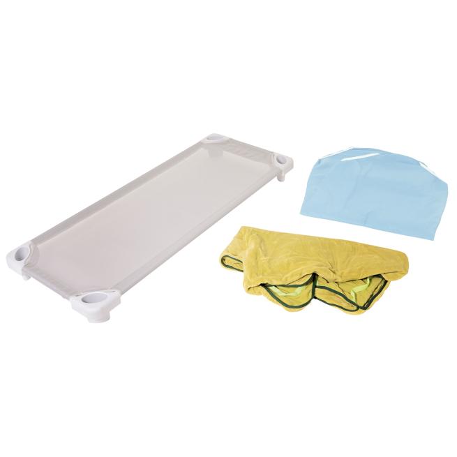 Die platzsparende Liege für Kinder besteht aus widerstandsfähigem Polyester mit Polychlorid-Beschichtung. Dadurch ist sie besonders strapazierfähig und pflegeleicht. Nach Gebrauch wischen Sie einfach mit einem feuchten Tuch drüber und schon ist die Kinderliege wieder einsatzbereit. Die atmungsaktive Liegefläche verhindert Wärmestau und Feuchtigkeitsansammlungen. Dank der schwer entflammbaren Materialien entsprechen die stapelbaren Kinderliegen hohen Sicherheitsanforderungen.Die weiche Auflage aus Baumwolle bietet zusätzlichen Komfort auf der Kinderliege. Im Winter hält sie schön warm. Abgeschrägte Ecken und die Eckgummis bieten sicheren Halt, damit nichts verrutscht. Auflagen- und Liegenfarbe harmonieren bestens miteinander. Zur grünen Liege gehört eine grüne Auflage, zur gelben Liege eine grüne, zur blauen eine blaue und zur grauen Liege eine blaue Auflage. Hygienisch rein waschen Sie die Auflagen bei 60 °C.