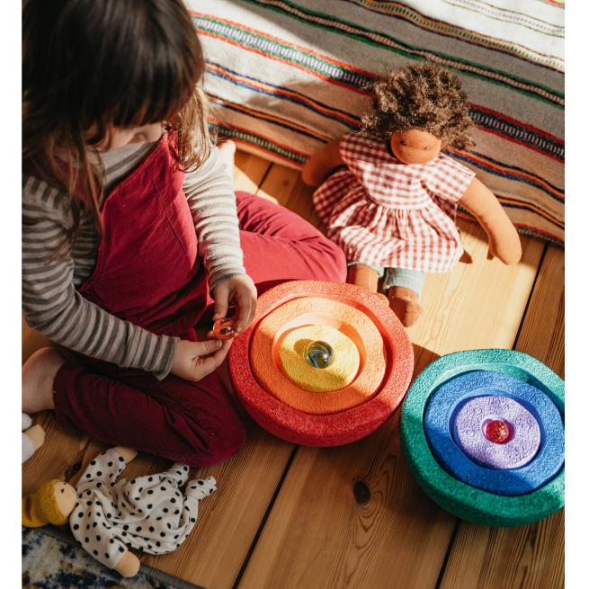 Das Set Inside rainbow classic besteht aus 6 ineinander stapelbaren Elementen in den starken Farben red, orange, yellow, dark green, blue und violet.