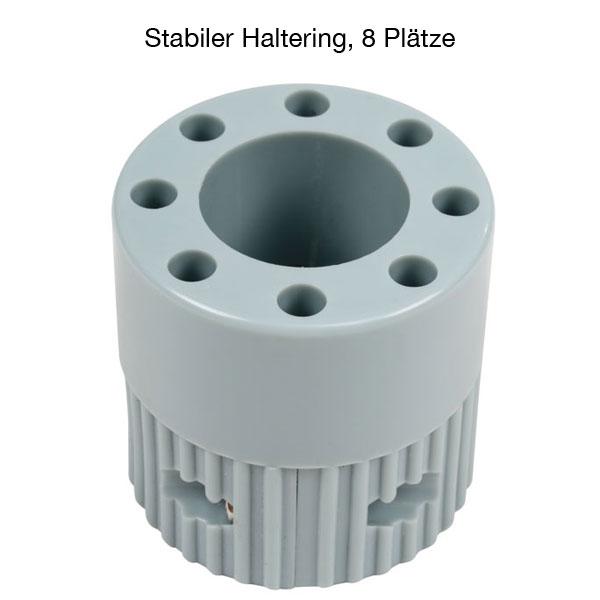Weiter Vorzüge: Die robuste 8-Loch-Ringhalterung hat für mehrere Tafeln gleichzeitig Platz. Dank integriertem Schraubendreher verschieben Sie die Ringe, so dass sich eine erweiterte Höhenverstellung für die Stecktafeln ergibt.