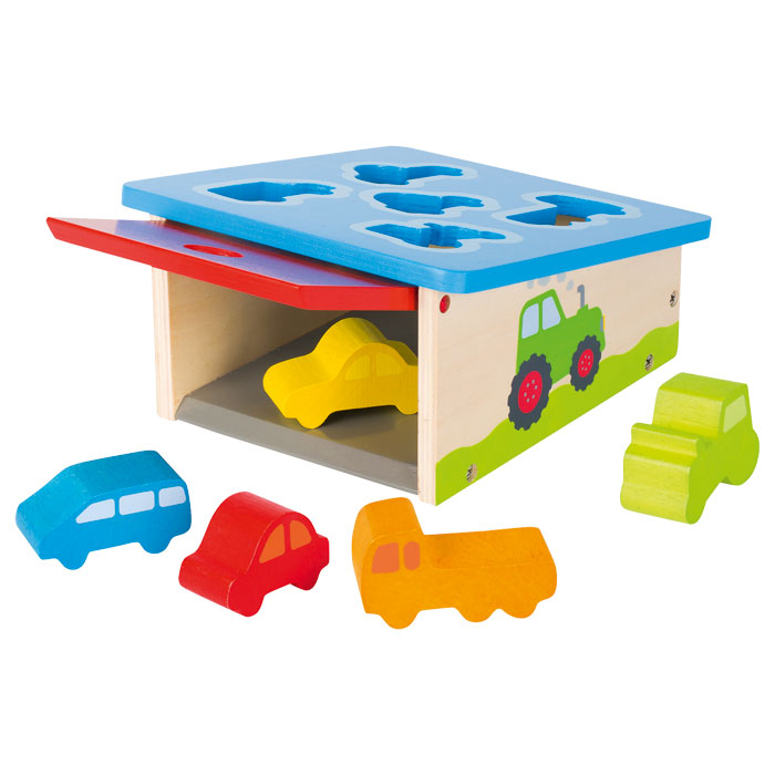 Fünf Fahrzeuge, fünf verschiedene Formen, eine Sortierbox-Garage. Wer findet heraus, welches Fahrzeug durch welche Öffnung passt?