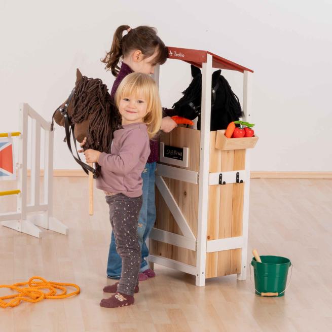Mit den Steckenpferden „Spirit“ und „Lucky“ erleben Kinder pure Bewegungsfreude und fantasievolle Abenteuer. Der weiche Polyester-Pferdekopf mit kuscheliger Mähne und das abnehmbare Zaumzeug laden zum aktiven Spielen ein. Auf dem stabilen, vollmassiven Buchenholzstab in kindgerechter Länge von 65 cm laufen, hüpfen und „reiten“ Kinder im Gruppenraum oder draußen durch eigene Geschichtenlandschaften. Ab 3 Jahren.