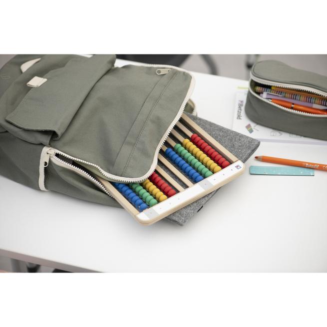 Tipp: Nutzen Sie den Rechenrahmen zusammen mit den Stellenwert-Würfeln für unterhaltsame Rechenspiele und -übungen. Die Kinder würfeln einzelne Zahlen, visualisieren diese am Rechenschieber und vergleichen die Größe der unterschiedlichen Zahlen.