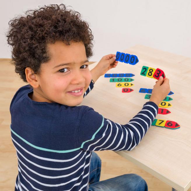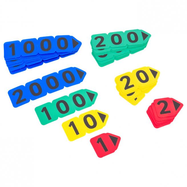 Die verschiedenfarbigen Stellenwertkarten helfen Ihren Schülern dabei, das Zehner- bzw. Dezimalsystem visuell zu begreifen. Für jeden Stellenwert, also Einer, Zehner, Hunderter, Tausender, sind Karten von 0 bis 9 enthalten. So stellen Sie mit Ihren Schülern jede Zahl von 0 bis 9999 dar, indem die Kinder sie einfach aufeinanderlegen.