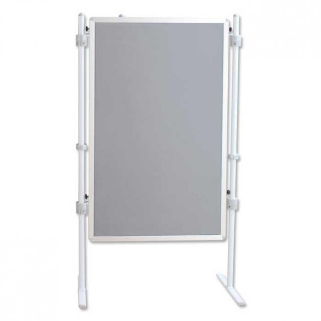 Klettmaterial haftet an dem Flanell. Bilder werden mit Pinn-Nadeln schnell und einfach angebracht. Die Tafeln sind doppelseitig zu verwenden und können hoch oder quer eingehängt werden. Die Stative haben einen zusätzlichen Sicherheitsring. Dieser sorgt dafür, dass die Tafeln in der Aufhängung bleiben. Das sorgt für Stabilität und Sicherheit.