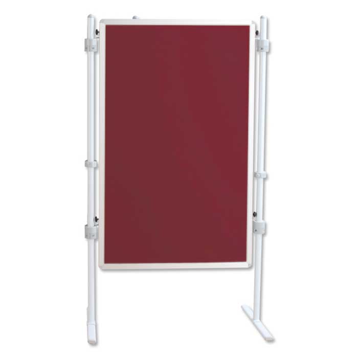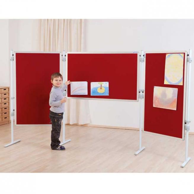 Klettmaterial haftet an dem Flanell. Bilder werden mit Pinn-Nadeln schnell und einfach angebracht. Die Tafeln sind doppelseitig zu verwenden und können hoch oder quer eingehängt werden. Die Stative haben einen zusätzlichen Sicherheitsring. Dieser sorgt dafür, dass die Tafeln in der Aufhängung bleiben. Das sorgt für Stabilität und Sicherheit.