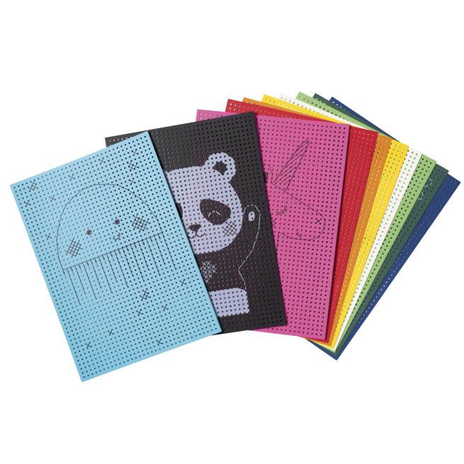 Mit den vorgedruckten Stickkartons fädeln Kinder verschiedene Motive nach und trainieren so ihre Hand-Auge-Koordination und Feinmotorik.