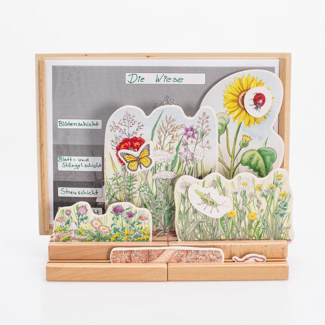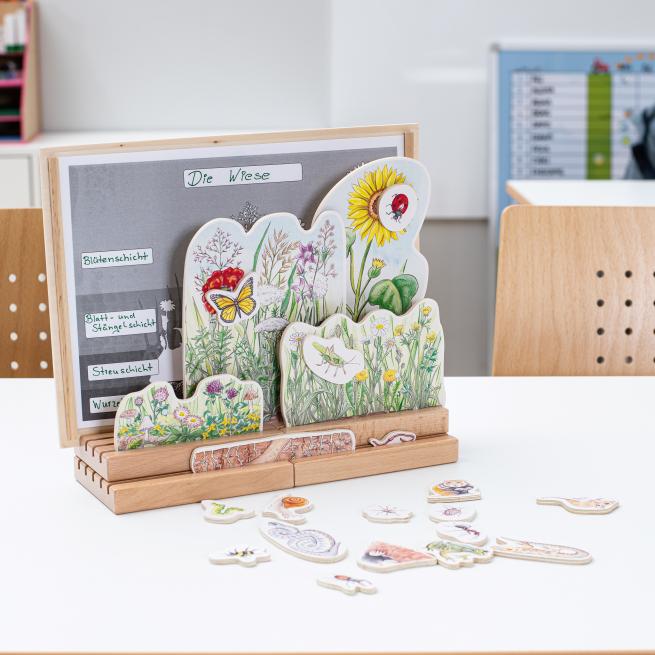 Das Set besteht aus 4 Holzleisten mit 4 bzw. 5 Führungsrillen. Damit sowie in Kombination mit den Wiesenschicht- und Tier-Motiven gestalten Sie gemeinsam ein anschauliches Wiesen-Ökosystem. Indem Sie 2 Setzleisten übereinanderstellen, stellen Sie die Wurzelschicht im Erdreich dar. Da einige Motive magnetisch sind, platzieren die Kinder z. B. die Tiere auf der Blütenschicht. Der Holzdeckel dient als Halterung für den Hintergrund. Dafür schieben Sie oder die Kinder die beiliegende Kopiervorlage oder ein selbst gemaltes Bild in den Deckel. Die freien Textfelder der Kopiervorlage beschriften Sie gemeinsam mit den einzelnen Schicht-Bezeichnungen „Wurzelschicht“, „Streuschicht“, „Blatt- und Stängelschicht“ sowie „Blütenschicht“. So festigt sich das Gelernte. Die Blanko-Vorlage nutzen Sie optimal für einen bilingualen Unterricht.Stockwerke der Wiese – ein Lernspiel für Kindergarten und Schule