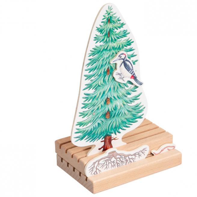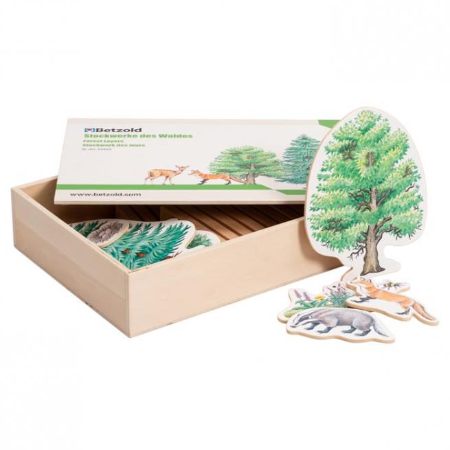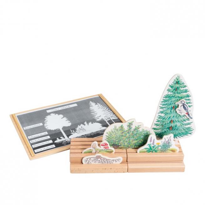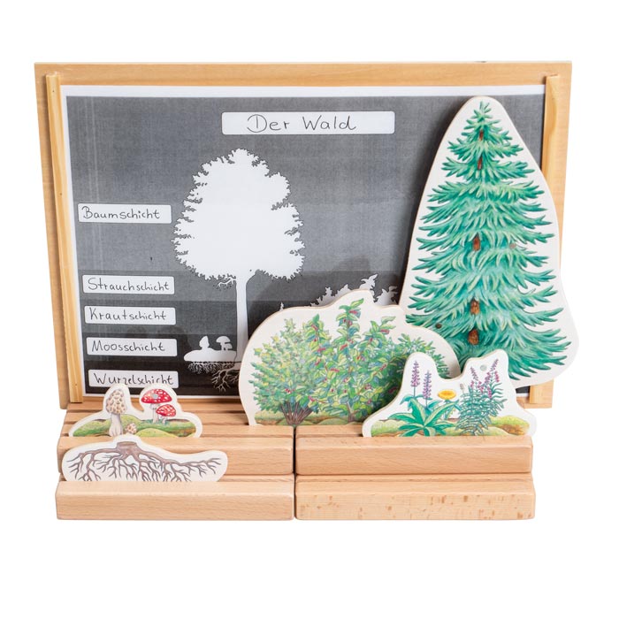 Wie der Wald aufgebaut ist, erkunden Kinder anhand des Lernspiels. In die 4 Holzleisten mit 5 bzw. 6 Führungsrillen schieben sie die entsprechenden Bilder zur Wurzel-, Moos-, Kraut-, Strauch- und Baumschicht. Zu welchen Schichten gehören eigentlich die unterschiedlichen Tiere? Einige Elemente sind magnetisch, sodass sie direkt an den Baum- oder Strauchbildern haften. Was die Kinder gelernt haben, halten sie auf den beiliegenden Kopiervorlagen fest.