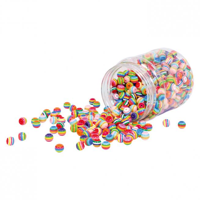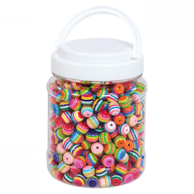 Ca. 480 runde, kunterbunt gestreifte Perlen in einer transparenten Kunststoffdose mit Drehverschluss.