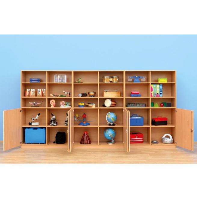 Mit 18 höhenverstellbaren und 6 festen Böden gestalten Sie insgesamt 30 Fächer. Im Bereich der abschließbaren Unterschränke erhalten Sie 12 Staufächer.