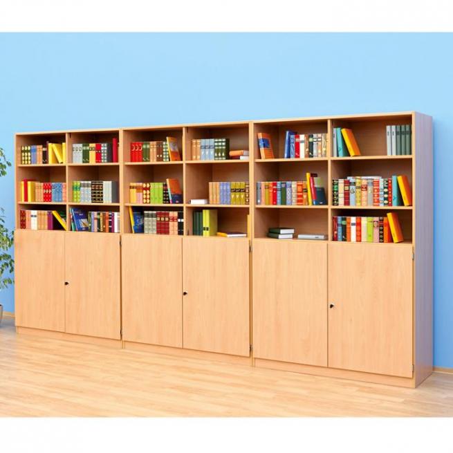 Im oberen Bereich bieten tiefe Regale reichlich Platz für 10,8 laufende Meter Bücher. Die Doppeltüren der geräumigen Unterschränke sind abschließbar. Ein eleganter Blickfang in Ihrer Schule!